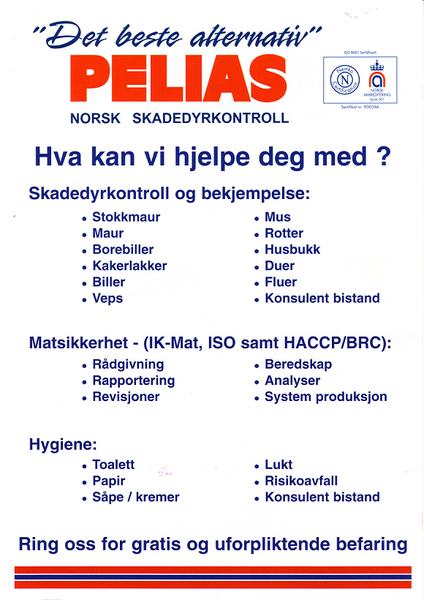 Pelias - Norsk Skadedyrkontroll har organisasjonsnummeret 971582162 og er registrert under bransjen Skadedyrbekjempelse.