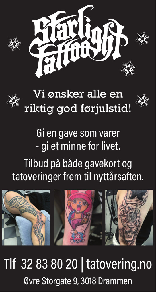 Masse motgang og en utrolig lang vei har han gått fra den gangen til dagens tatoveringsstudio, Starlight Tattoo, som ligger i Øvre Storgate 9. Hans pågangsmot er årsaken til at mange har tatovering som levebrød, og at tatovering i dag blir utført i godkjente lokaler.