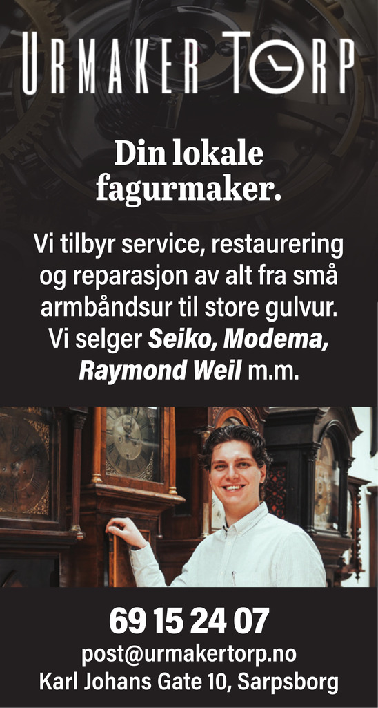 Urmaker Torp AS er et urmakerverksted med butikk i Sarpsborg sentrum. I 2019 overtok vi virksomheten etter urmakermester Erik Ødegaard, som drev forretningen i nesten 50 år. Vi bygger videre på et solid faglig grunnlag gjennom videreført kunnskap, verktøy og håndverkstradisjon.